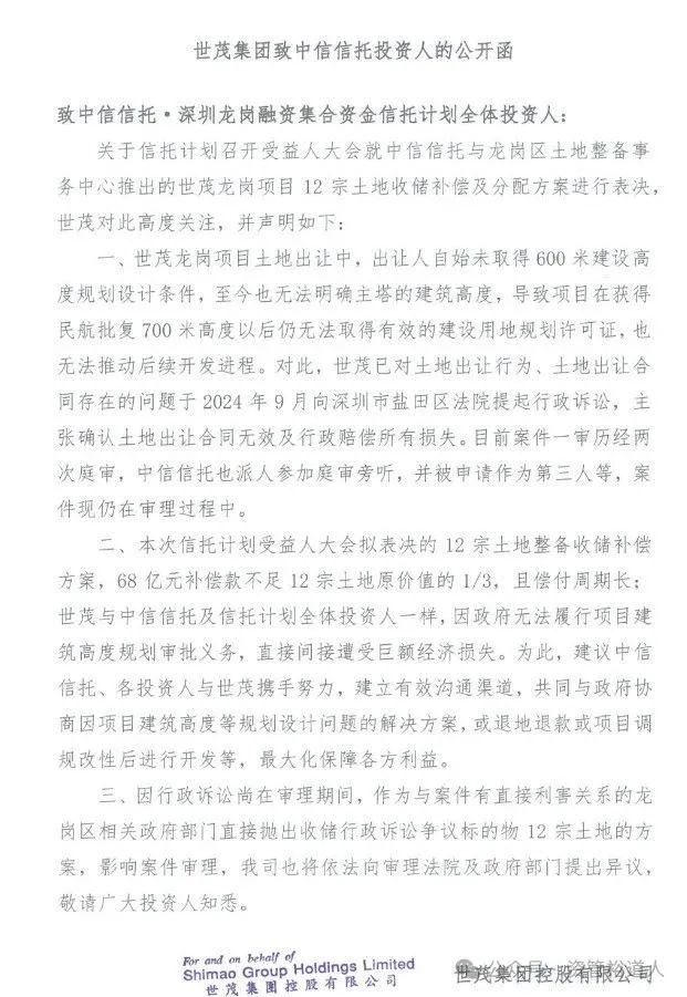 “对于信赖野心召开受益东谈主大会就中信信赖与龙岗区地皮整备事务中心推出的世茂龙岗形态12宗地皮收储抵偿及分拨决议进行表决世茂对此高度温雅,并声明如下: