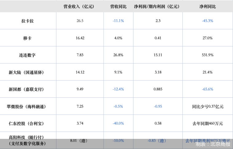 从功绩进展来看,各机构分化彰着。移卡、连连数字、国通星驿三家营收、净利润扫尾双增。其中,移卡商业收入16.42亿元,同比增4%,扫尾期内利润4137万元,同比增27%;国通星驿营收、净利润分辨报14.12亿元、3.18亿元,同比增长9.1%、21.4%。